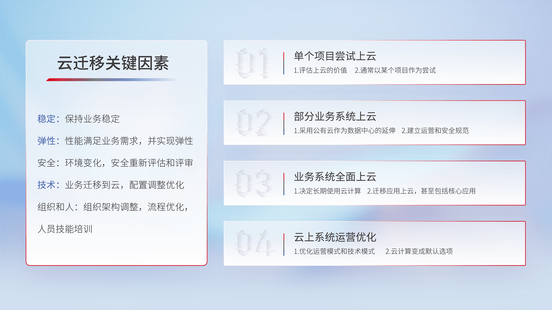 结合实际业务,,,,从规划设计、、云平台选型、、、云原生改造、、、、数据迁移、、集成交付,,,迁移全过程为客户识别最佳上云路径,,做好风险识别管理,,设计网络架构、、、身份权限、、、安全审计合规、、、、操作审计、、、、日志审计、、监控告警策略、、、、多站点容灾设计等,,,对云上基础设施进行整体规划,,,提升IT治理水平,,以满足弹性、、、、高可用、、、、高性能的需求。。。。