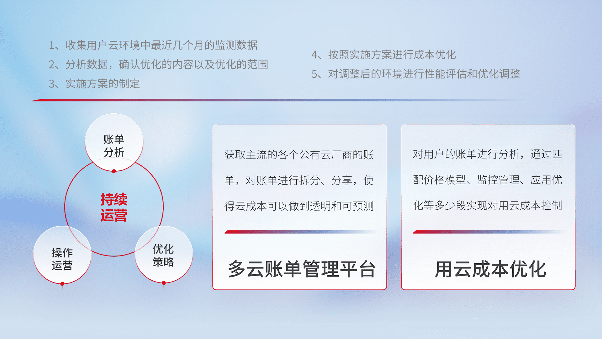 通过多云纳管,,,,以统一的资源数据模型把客户的云资源进行抽象和封装,,,进而实现对多云资源的统一操作,,,,保障云资源管理的可靠性、、稳定性与可用性。。。。量身定制化运维内容,,配置、、、、开发运维、、、、补丁管理、、、备份、、、监控、、、、认证和访问管理、、审计和日常巡检等,,保障在用云过程中的可靠度,,稳定度以及高可用率。。。
